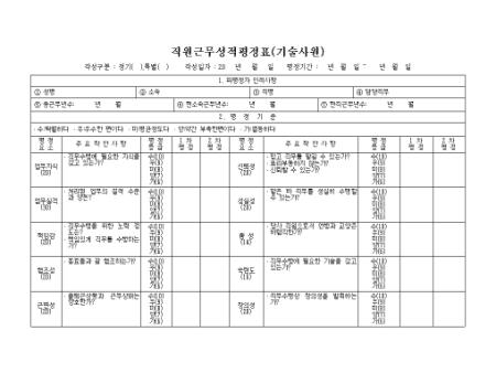 기술사원의 근무성적을 업무지식, 업무실적, 책임감, 협조성, 근면성등의 항목으로 평가할 때 사용하는 양식입니다.