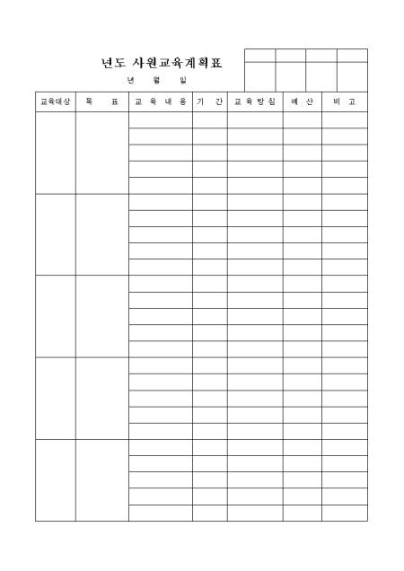교육대상,목표,교육내용,기간,교육방침,예산,비고로 구성된 사원교육계획표입니다.