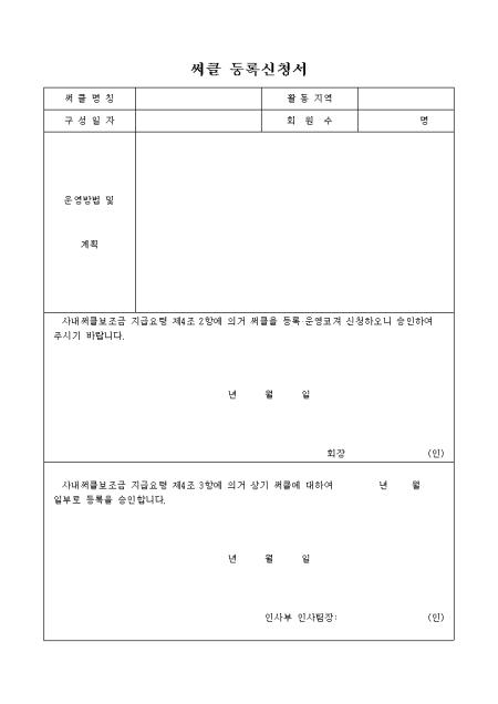 명칭,활동지역,구성일자,회원수,운영방법 및 계획을 기록하는 써클등록신청서입니다.