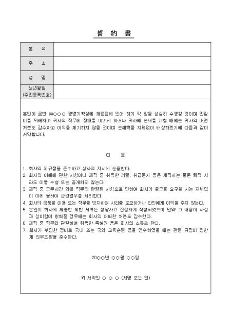 특정부서에 채용됨에 있어 그 부서의 직무에 장애를 야기하거나 손해를 끼칠시 손해액을 배상하겠다는 내용의 서약서입니다.
