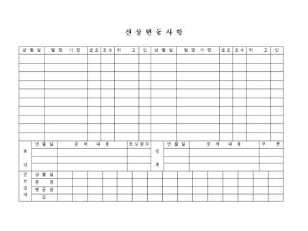 발령사항,급호,호수,포상,근무성적을 기록하는 신상변동사항 양식입니다.