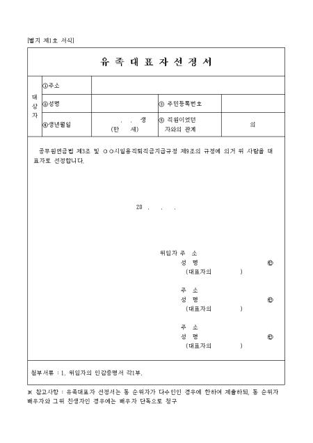공무원연금법 제3조 및 ○○시일용직퇴직금지급규정 제9조의 규정에 의해 유족대표자를 선정할때 사용하는 양식입니다.