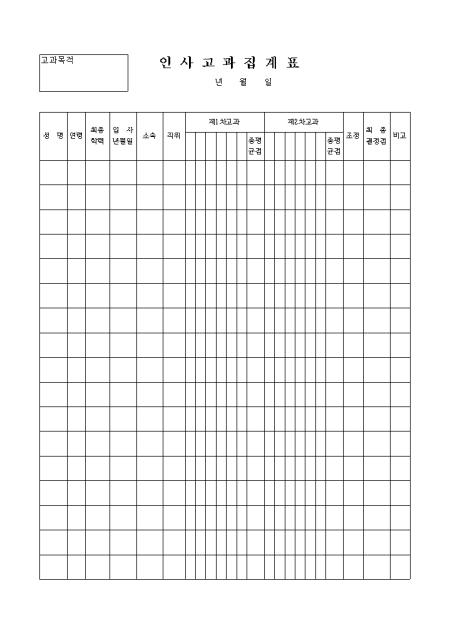 성명,연령,최종학력,입사년월일,소속,직위,고과점수,최종결정점을 기록하는 인사고과집계표입니다.