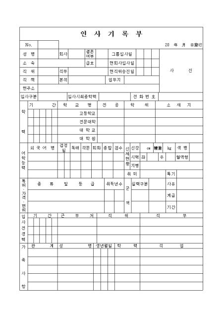 학력,어학능력,자격증내용,경력,가족사항을 기록하는 인사기록부입니다.