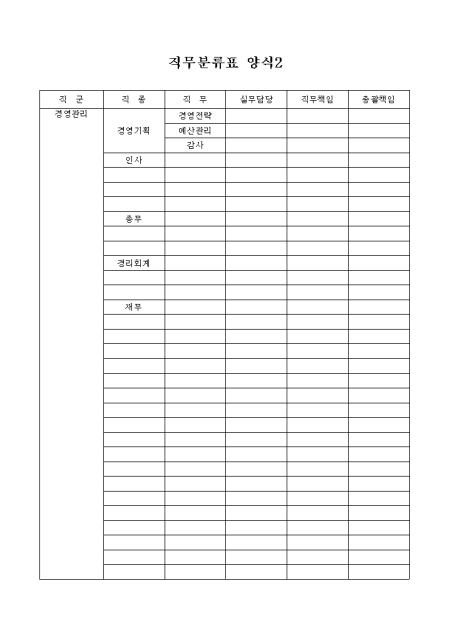 직군,직종,직무,실무담당,직무책임,총괄책임으로 구성된 직무분류표 양식입니다.