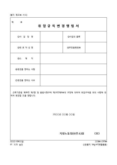 근로기준법 제99조제2항 및 동법시행규칙 제19조제8호의 규정에 의하여 취업규칙변경할때 사용하는 양식입니다.