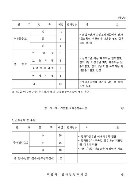 평가항목,배점,평가점수,비고로 구성된 해외 일반교육 후보자 종합평가표 뒷면입니다.