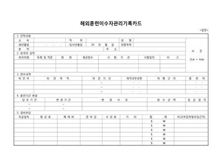 인적사항,외국어 성적,연수내역,훈련기간 변경,경비부담으로 구성되어 있습니다.