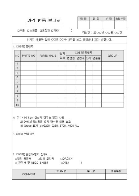 PARTS NO,PARTS NAME,협력업체,COST변동내역,GROUP를 기록하는 가격변동보고서입니다.