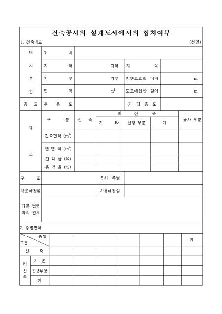 대지조건,용도,규모,구조,공사종별,착공예정일,사용예정일,층별면적을 기록하여 건축공사의 설계도서에서의 합치여부를 알아보는 양식입니다.
