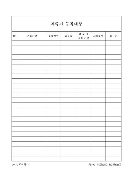계측기명,등록번호,입고일,검교정 유효기간,사용부서를 기록하는 양식입니다.