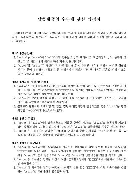 납부 대금의 수수에 관해 양 업체간의 약정한 내용을 기입하는 양식으로 모두 8조항으로 구성되어 있습니다.