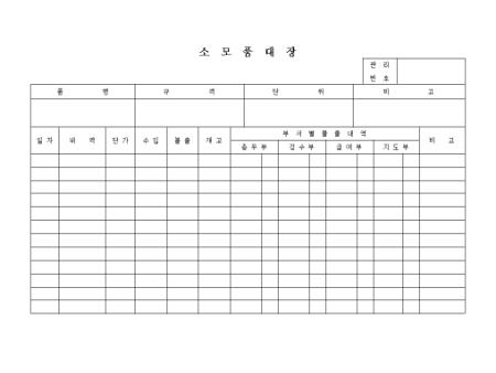 품명,규격,단위,소모품 내역,부서별불출내역을 기록하는 소모품대장입니다.