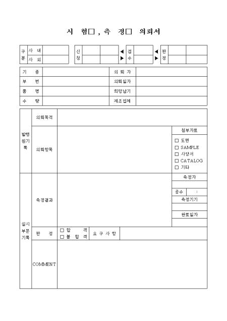 의뢰목적,의뢰항목,측정결과,판정결과를 기록하는 시험,측정의뢰서입니다.