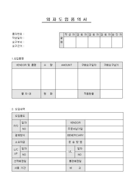 도입품명,도입내역을 기록하는 외자도입품의서입니다.