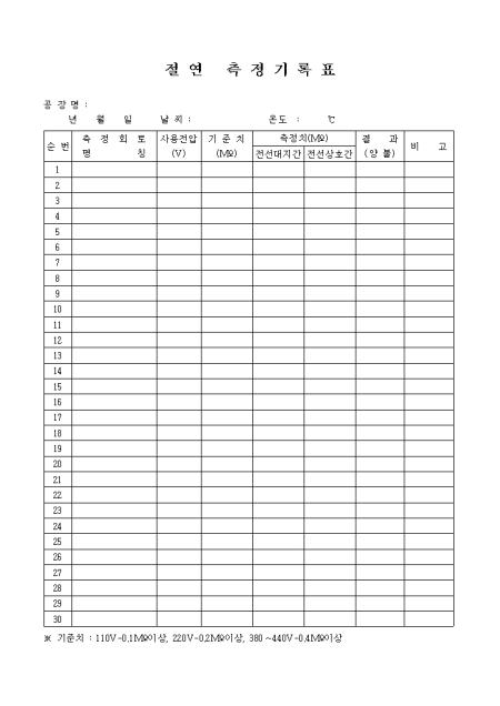 측정회로 명칭,사용전압,기준치,측정치,결과를 기록하는 절연측정기록표입니다.