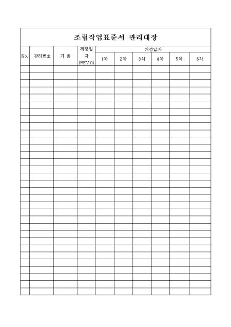 관리번호,기종,제정일자,개정일자를 기록하는조립작업표준서 관리대장입니다.