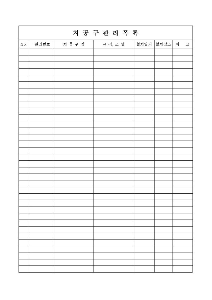 9,000원/월관리번호,치공구명,규격,설치일자,설치장소를 기록하는 치공구관리목록표입니다.