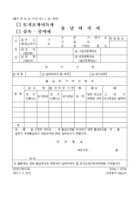 신청한 (토지초과이득세, 상속증여세)에 대한 물납신청을 허가할때 사용하는 양식입니다.
