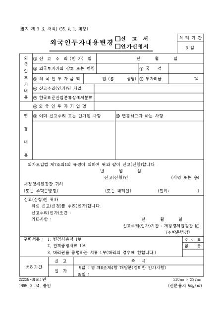 별지 제 3호 서식으로 외국인 투자내용 변경할때 사용하는 양식입니다.