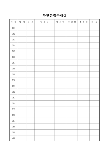 월일,구분,발송국,발신인,수신인,수령인,비고란으로 구성된 우편물접수대장입니다.