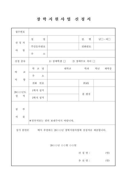 신청자사항,신청종류,학교사항,년도성적을 기록하는 장학지원사업 신청서입니다.