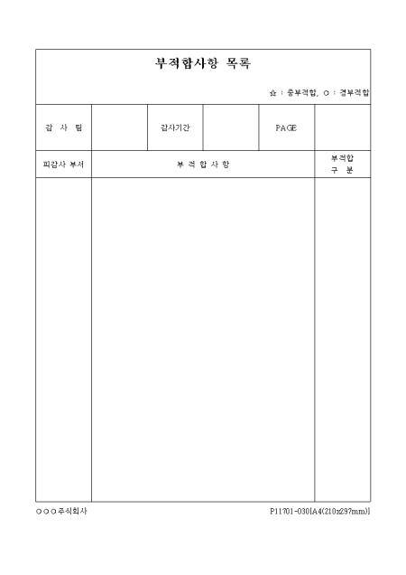 감사를 통한 부적합사항을 기록하는 양식입니다.