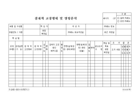 공정에 대한 잠재적 고장형태와 고장영향,고장원인, 발생도등의 항목으로 구성된 분석형태의 서식입니다.