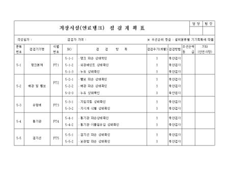 연료탱크(탱크본체, 배관 및 밸브, 유량계.통기과, 접지선)의 항목별 점검 계획표 양식입니다.