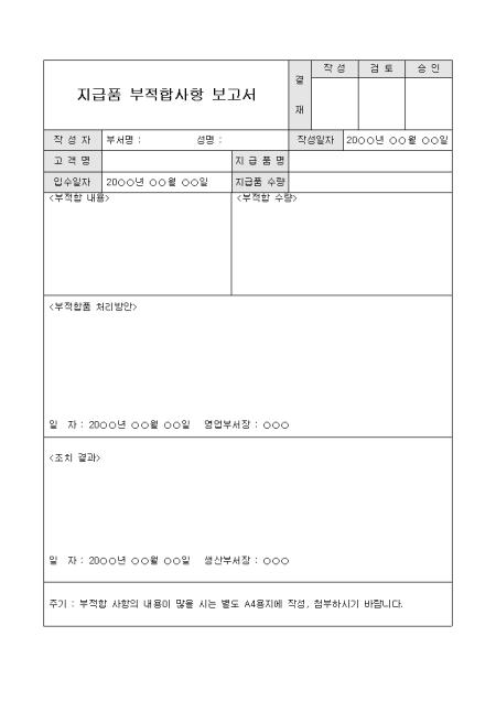 지급한 제품에 관한 부적합 내용과 처리방안, 조치결과등을 보고할 때 사용하는 양식입니다.