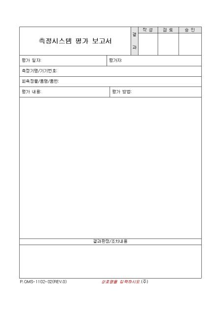 평가일자, 평가가, 측정기명,피측정물, 평가내용등의 항목으로 구성되어 있는 측정시스템 평가 보고서 양식입니다.