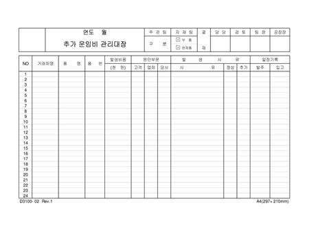 거래처명,품명,품번,발생비용,원인부문,발생사유,일정기록을 기재하는 추가 운임비 관리대장입니다.