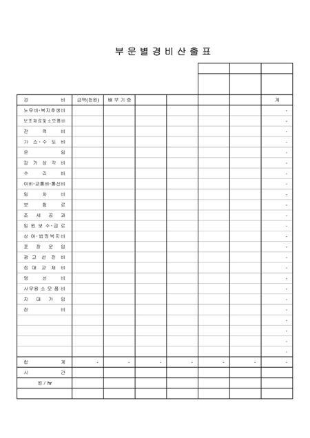노무비,복지후생비, 전력비...지대가임..잡비등의 항목별 경비산출표 양식입니다.