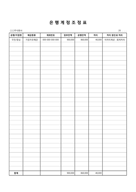 예금종류, 계좌번호, 장부잔액, 은행잔액,차액, 차이의 원인과 처리에 관련 세부사항을 기재하도록 되어 있는 은행게정조정표 양식입니다.