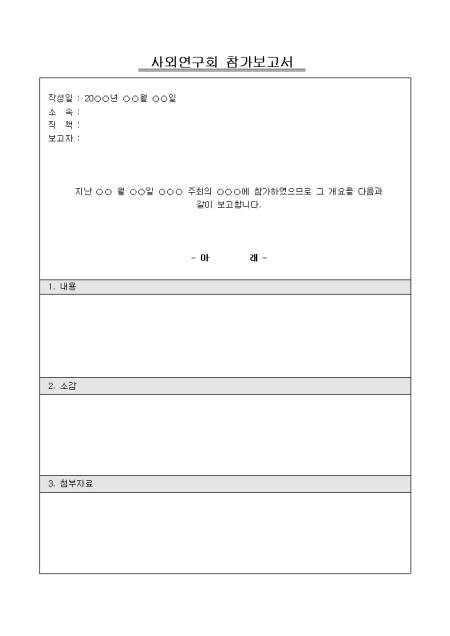 사외의 연구회 참가에 대한 내용을 보고할 때 사용하는 양식입니다.
