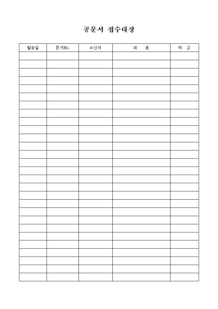 발송일,문서번호,수신처,내용,비고란으로 구성된 공문서 접수대장입니다.