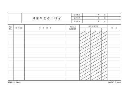 제/개정일,개정내용,적용근거,배포처/배포수,비고란으로 구성된 기술표준관리대장입니다.
