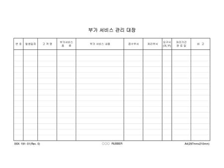 번호,발생일자,고객명,부가서비스종류,부가서비스내용,접수부서,처리부서,요구서,처리기간완료일을 기록하는 부가서비스관리대장입니다.