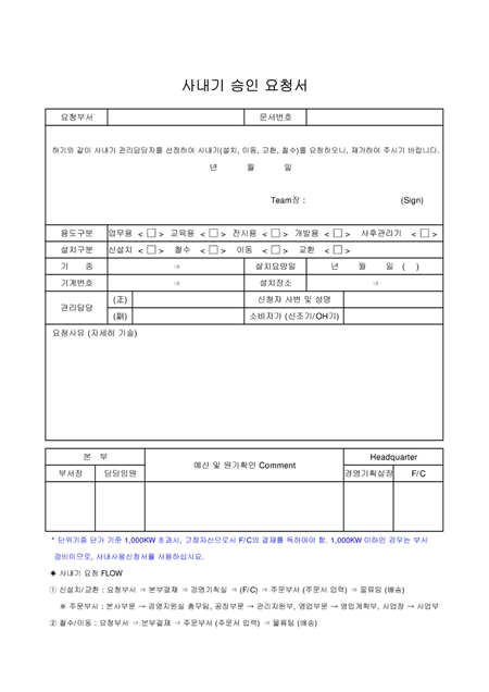 용도구분,설치구분,기종,기계번호,설치장소,요청사유를 기록하는 사내기 승인요청서입니다.