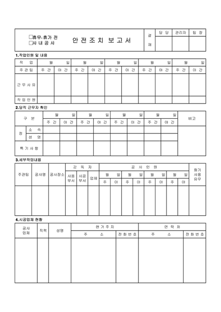 작업인원 및 내용,당직근무자확인,세부작업내용,시공업체 현황을 기록하는 안전조치보고서입니다.