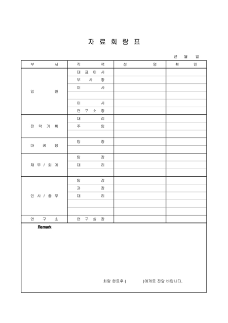 부서,직책,성명을 기록하는 자료회람표입니다.