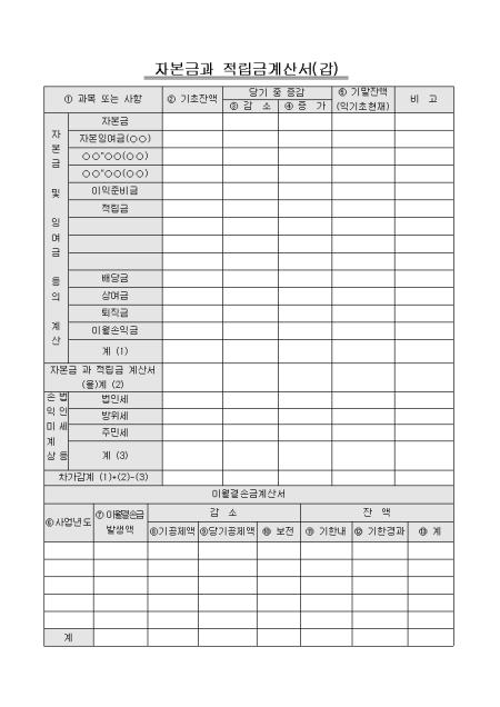 자본금 및 잉여금등의 계산내역과 법인세등 손익계산,이월결손금에 대한 계산내역을 기재하는 계산서 양식입니다.