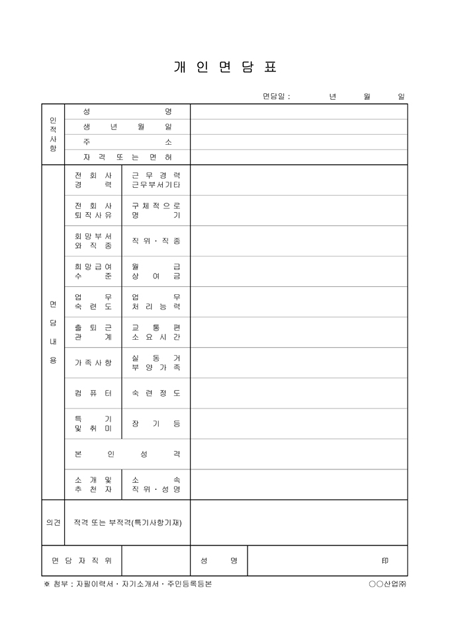 개개인의 면담내역양식입니다. 면담내용으로는 경력, 전회사 퇴직사유, 희망부서, 희망급여, 출퇴근관계, 가족사항등의 내용입니다.