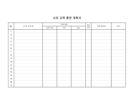 사외교육의 훈련내역을 교육과정명별 일정, 인원등의 항목별로 계획할 때 사용하는 양식입니다.