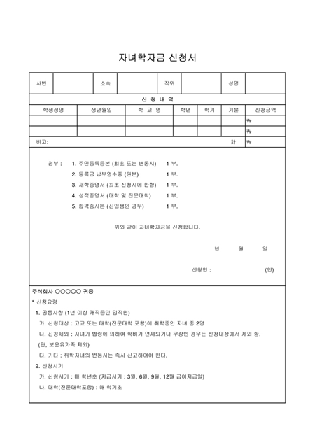 자녁 학자금 신청양식입니다. 첨부서식을 추가하여 회사에 제출합니다.