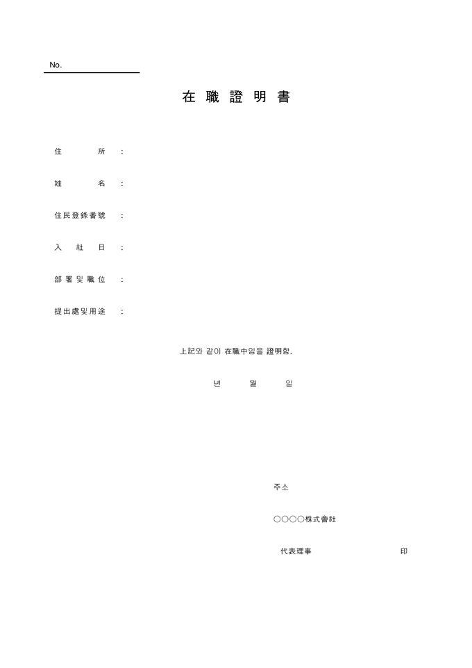 9,000원/월회사의 재직중임을 증명할 때 발급하는 양식으로 한글과 한문양식이 각각 있습니다.