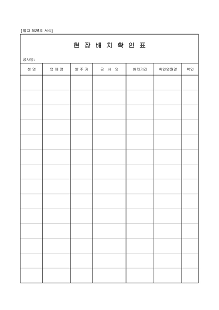 성명, 업체명, 발주자, 공사명, 배치간등의 항목으로 구성되어 있는 현장배치확인표양식입니다.