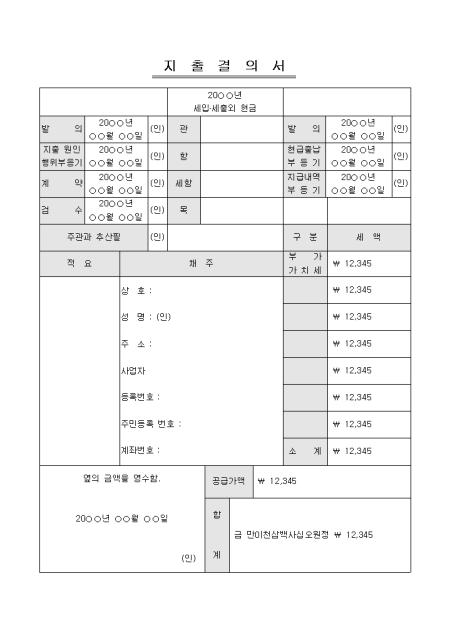 년도별 세입세출외 현금에 대한 지출경의서 양식으로 발의일 지출원행위부등기일등과 채주내역들을 기재하도록 되어 있습니다.