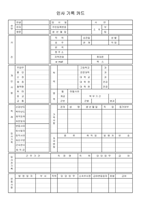 사진부착란,인적사항,학력,병력,가족사항등을 기록하는 인사기록카드입니다.