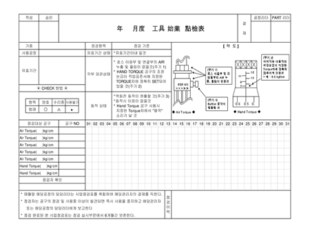 사용공정,유효기간,점검항목,점검기준,점검대상공구를 기록하는 공구 시업 점검표입니다.
